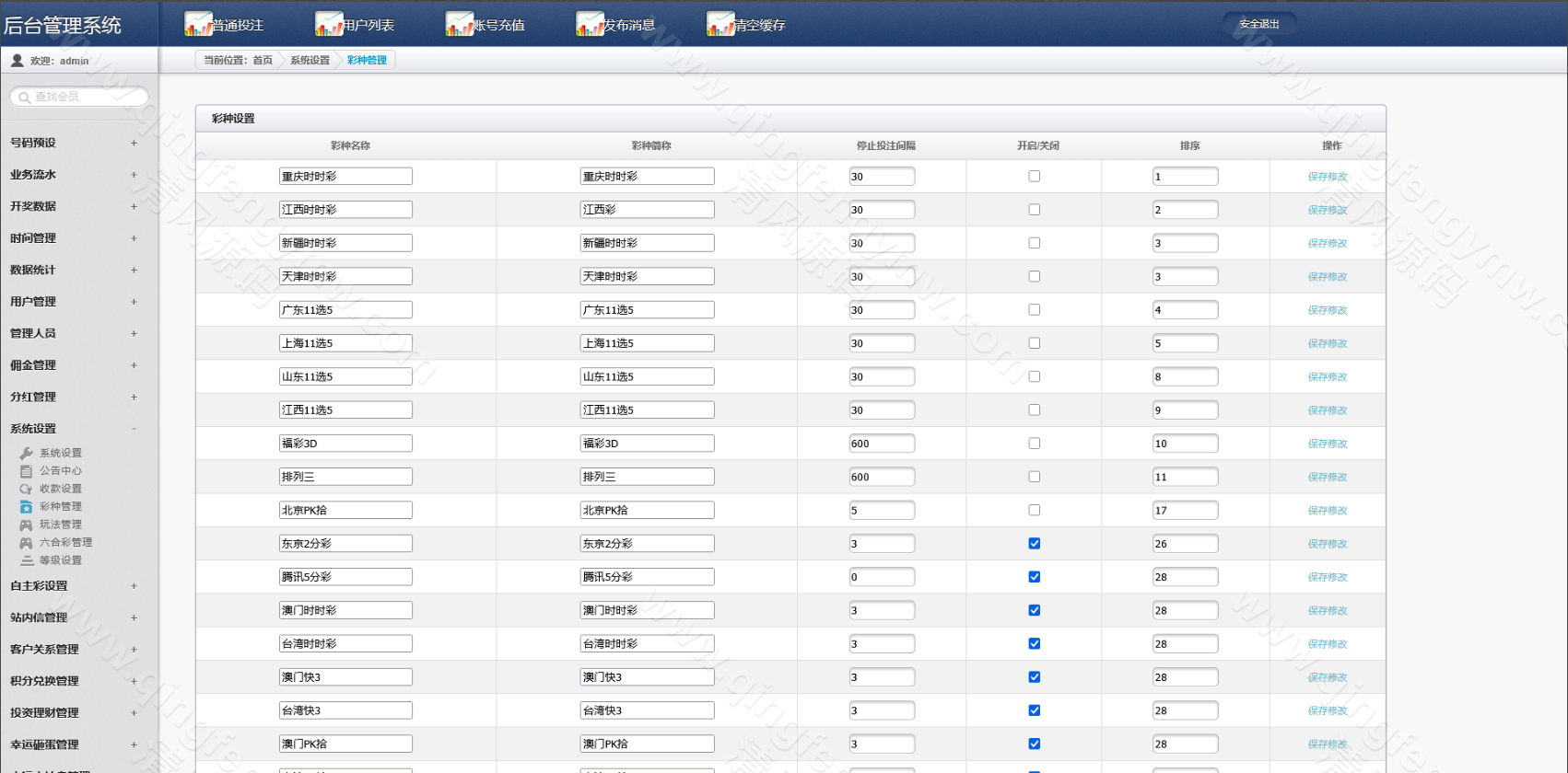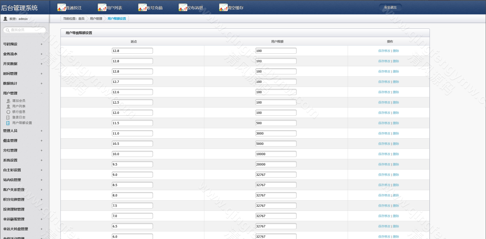 在“系统设置”中,关键配置项包括:打水开关与策略、返利比例参数、对刷规则限制。