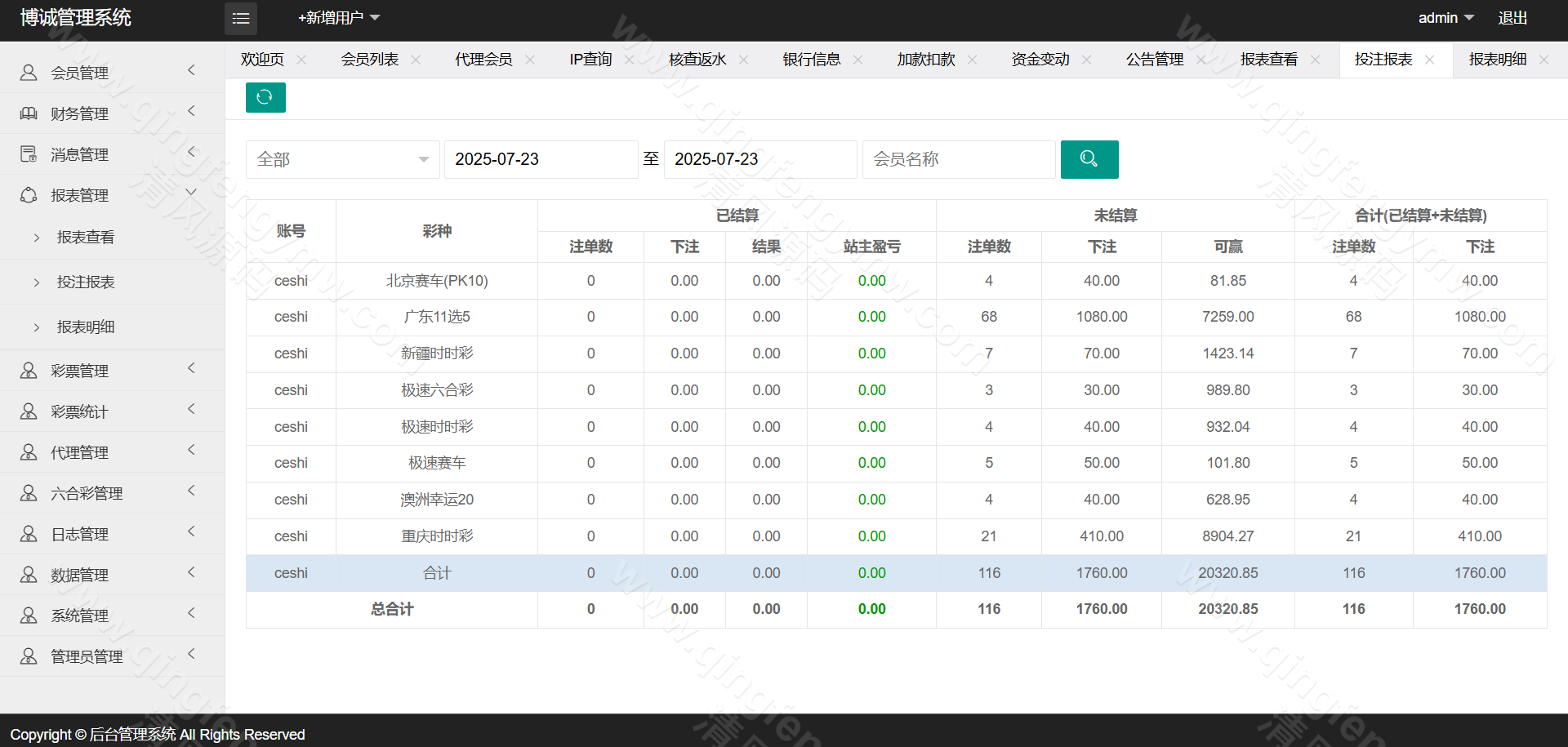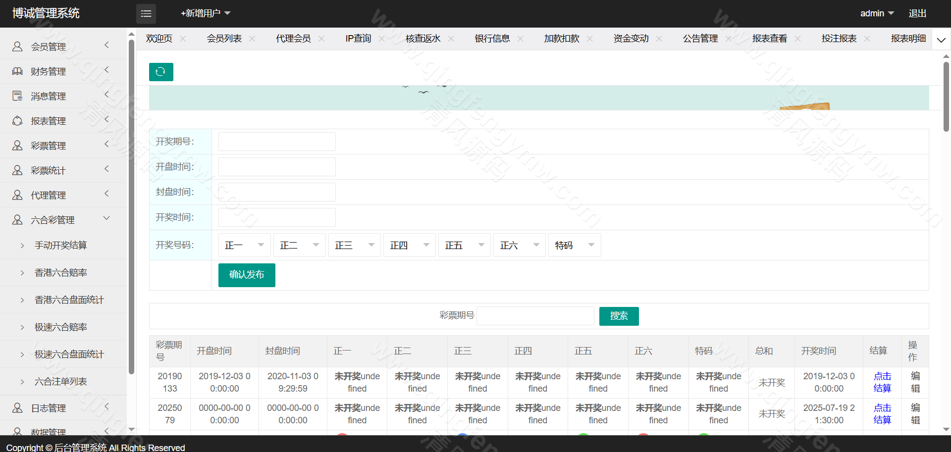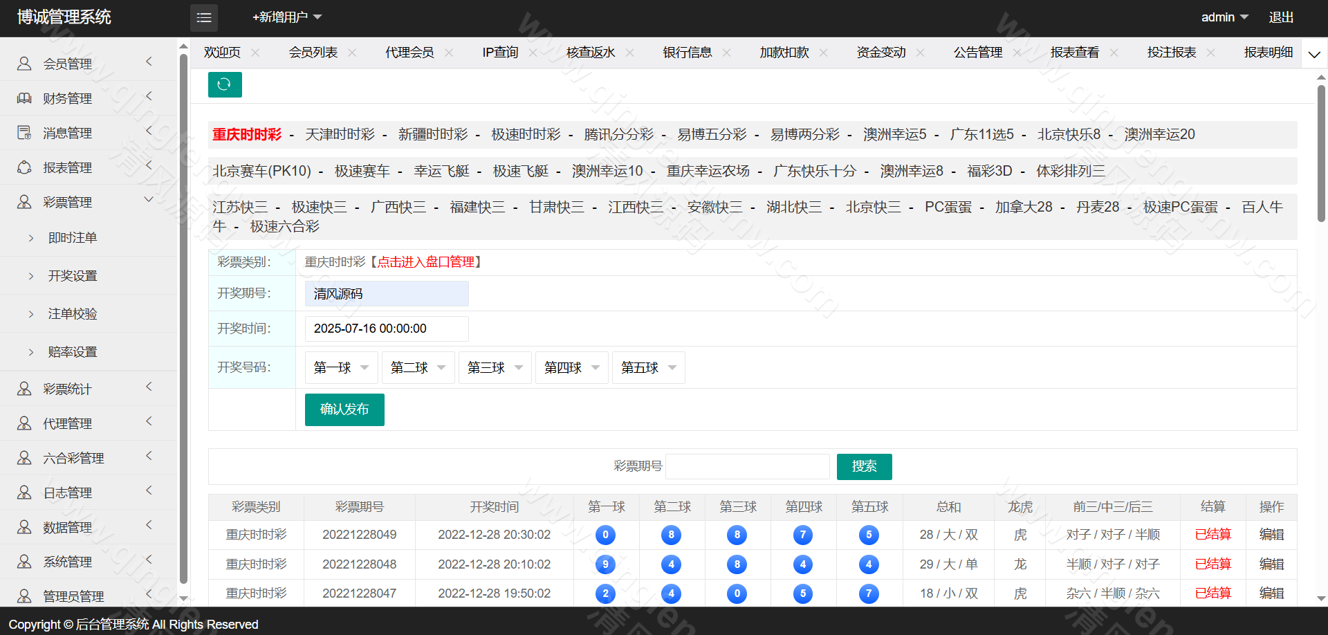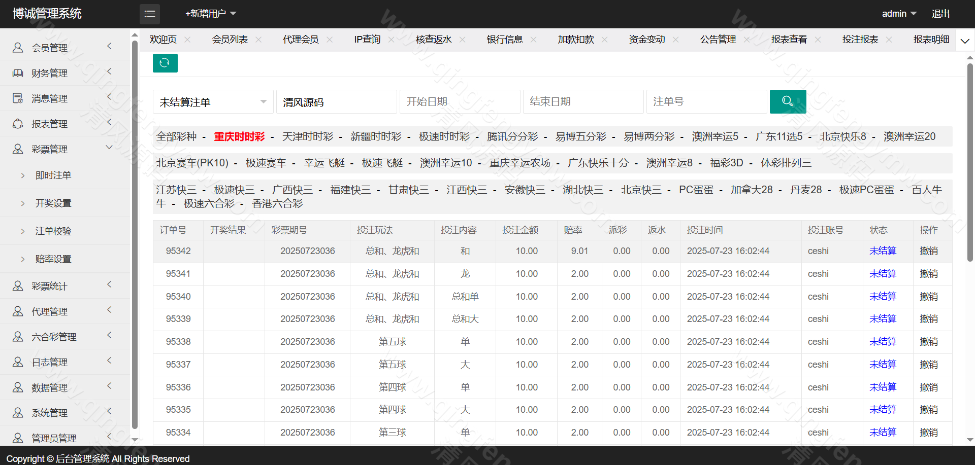 后台管控中心:提供玩法开关、赔率调整、注单审核、手动结算等运营控制功能。
