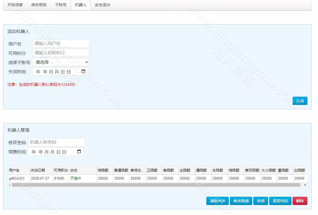 机器人后台 一键生成会员及托账号,两类账号均可设置自动或手动下注,