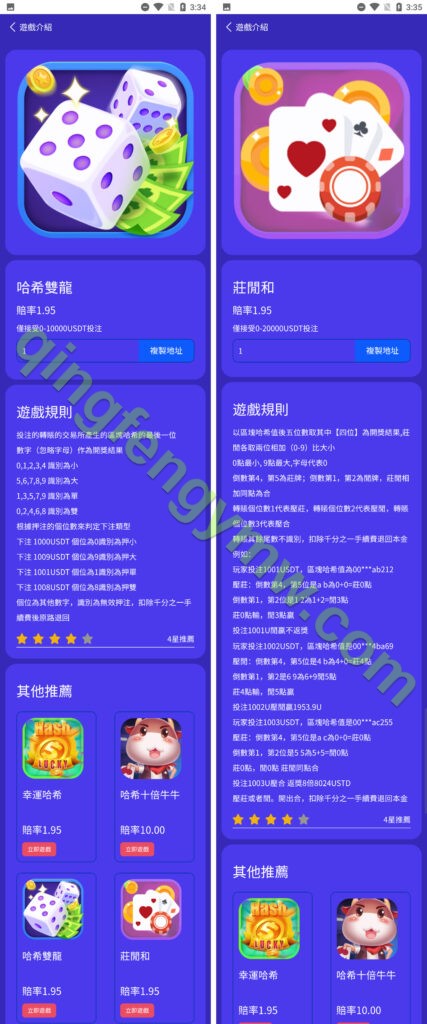 系统包含游戏:幸运哈希、哈希牛魔王、哈希双龙、庄闲合